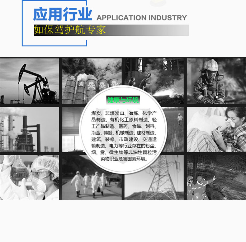 選用推薦:適用于霧霾,面粉加工廠,礦廠(礦物加工粉塵),棉花加工,五金鑄造,汽車尾氣中產(chǎn)生的粉塵和部分有毒氣體環(huán)境可選用濾棉搭配濾毒盒進行防護