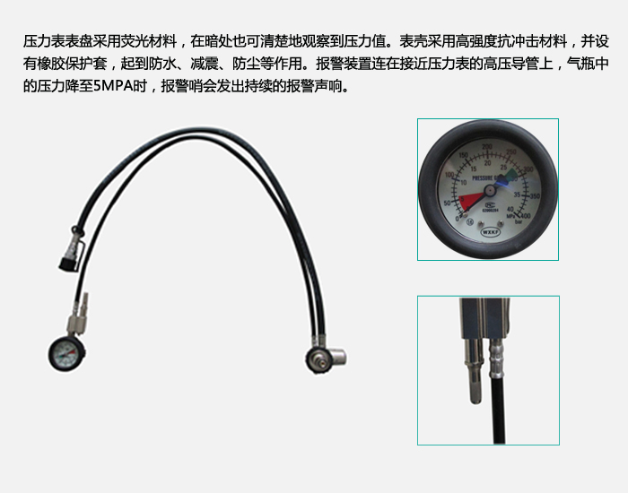| 產(chǎn)品型號(hào) | 氣瓶容積 | 氣瓶工作壓力 | 報(bào)警壓力 | 儲(chǔ)氣量 | 最大供氣流 | 呼氣阻力 | 吸氣阻力 | 整機(jī)重量 | 使用溫度 | 使用時(shí)間 |