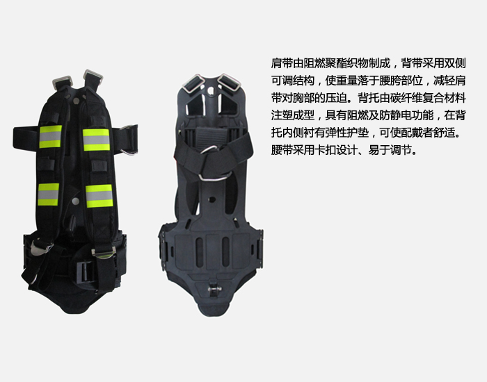 1.佩戴時(shí),先將快速接頭斷開(以防在佩戴時(shí)損壞全面罩),然后將背托在人體背部(空氣瓶開關(guān)在下方),根據(jù)身材調(diào)節(jié)好肩帶、腰帶并系緊,以合身、牢靠、舒適為宜。